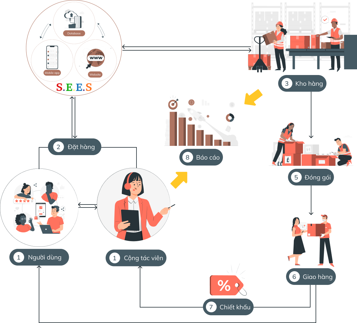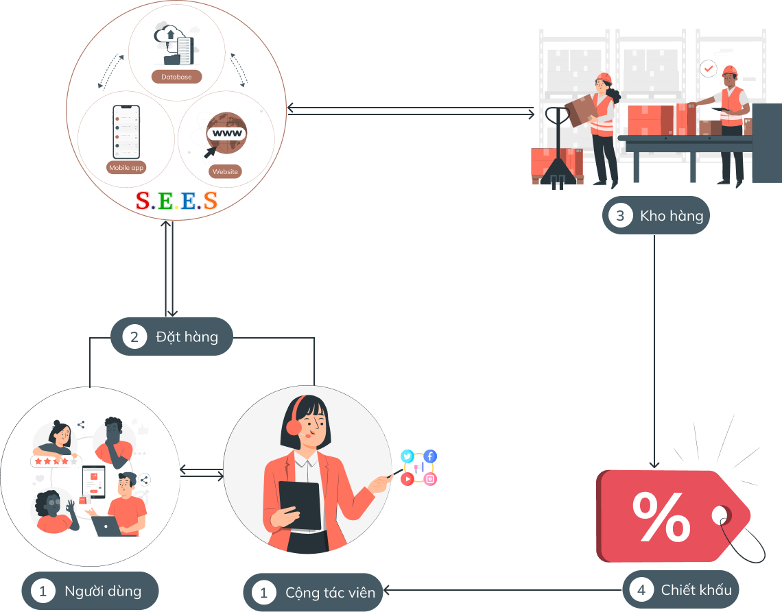 SEES cung cấp một sàn thương mại điện tử B2B2C, vài trò nhà cung cấp là nhà cung cấp online được cấp tài khoản để nhập hàng và tuyển cộng tác viên hoặc người tiêu dùng vào hệ thống, người tiêu dùng có thể mua hàng, còn cộng tác viên thì có thể bán hàng online thông qua 3 bước đơn giản: Chọn sản phẩm, chia sẻ lên kênh nào (Facebook, Zalo,…) và chọn chia sẻ lên inbox hoặc tường nhà. Với lợi thế không cần nhập hàng trước, không cần chuẩn bị vốn, khi có đơn hàng doanh nghiệp quản lý sàn sẽ chủ động gửi hàng đến người mua và hệ thống chia hoa hồng khi đơn hàng hoàn thành.