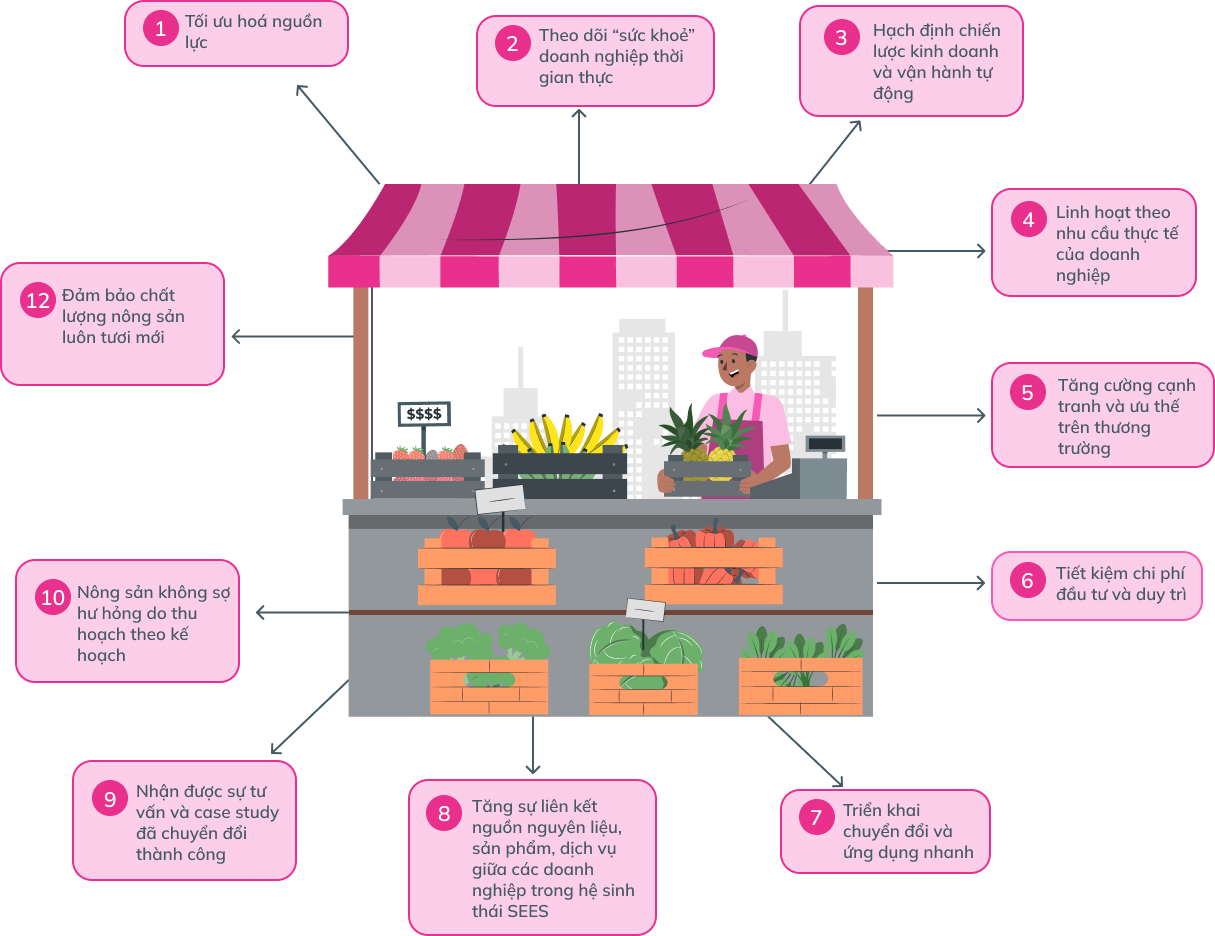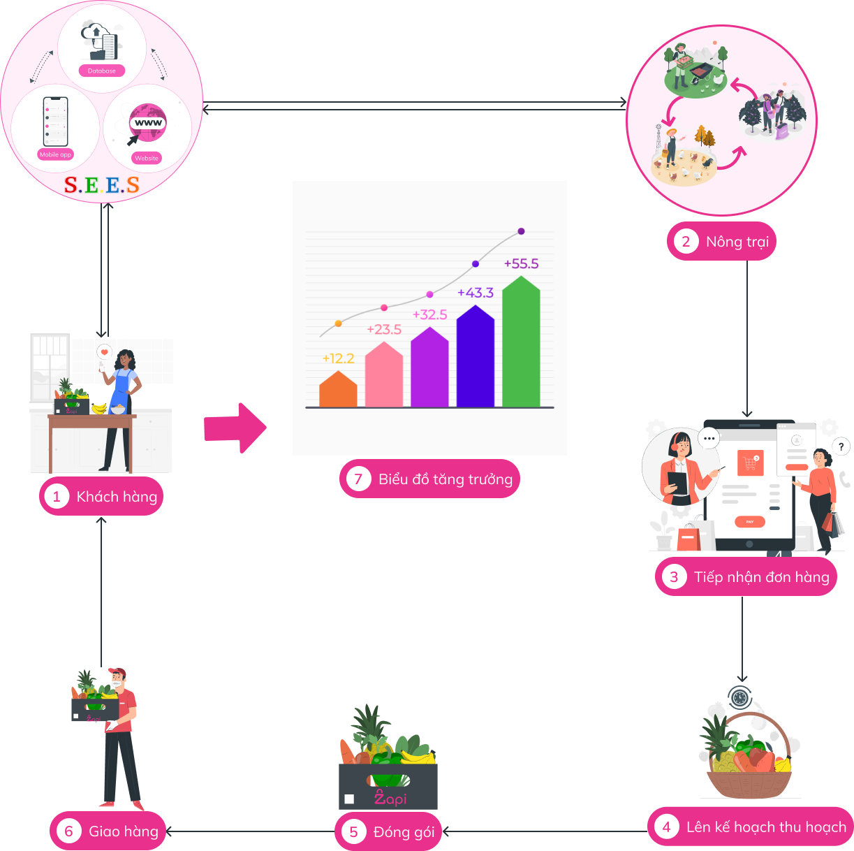 Giúp chủ doanh nghiệp quản lý mô hình cung cấp nông sản sạch từ nông trại, vườn được kiểm soát bởi quy trình của đơn vị chủ quản đến thẳng nhà cho các nhà hàng, đầu bếp và các mẹ, các bà nội trợ. Đảm báo tối ưu quy trình sản phẩm nông sản nhanh nhất để đến người có nhu cầu, sản phẩm đến tay người dùng luôn được tưới mới nhất